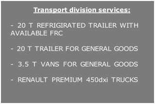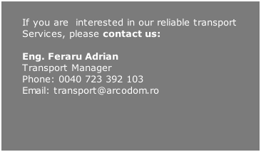 +  ROMÂNĂ Superior services for cargo transport Our company is fitted with trucks and vans. We are able to deliver a large  variety of goods to any destination around Europe. Drivers are carefully  selected and a transport manager will make sure the goods arrive safe and on time.